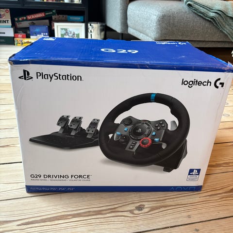 Logitech G29 rat og pedalsæt til PlayStation og PC. Sættet består af et sort rat med læderbetræk og integrerede PlayStation-knapper samt et separat pedalsæt med tre pedaler (kobling, bremse og speeder). Rattet har skiftepedaler bagpå og flere funktionsknapper på fronten. Pedalsættet har metalpedaler monteret på en plastbase med skridsikre felter. Tilsluttes med kabler, som følger med på billederne. Velegnet til racingspil på kompatible PlayStation-konsoller og PC, afhængigt af understøttet software og drivere.