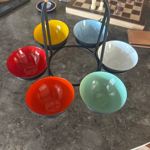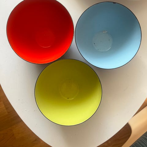 Skålsæt bestående af tre skåle i forskellige størrelser. Skålene er røde indvendigt og mørke udvendigt. Velegnet til dekoration i hjemmet. Størrelse 9-13-16 cm. Sælges samlet 500 kr.
