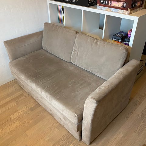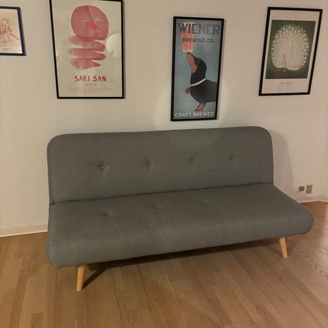 Sovesofa i grå tekstil. Sofaen kan foldes ud til en dobbeltseng, som vist på billederne. Den har to løse ryghynder med knapper på forsiden. Under madrassen er der en træramme, som fungerer som understel. Velegnet som kombineret sofa og seng i stue, gæsteværelse eller mindre rum, hvor der er behov for en ekstra soveplads. Købt hos Møbler. Ny pris 3.999,-. Kan leveres inden for Silkeborg Kommune. Giv et bud for en hurtig handel.
