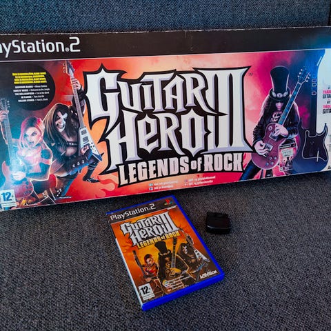 Playstation 2 Guitar Hero Aerosmith spil med guitarcontroller. Sættet indeholder Guitar Hero Aerosmith spil til Playstation 2 og en trådløs guitarcontroller med farvede knapper på gribebrættet. Der medfølger desuden Guitar Hero Metallica spil til Playstation 2. Velegnet til musik- og rytmespil på Playstation 2 konsollen med mulighed for at spille både alene og i flerspiller, afhængigt af konsol og ekstra udstyr.