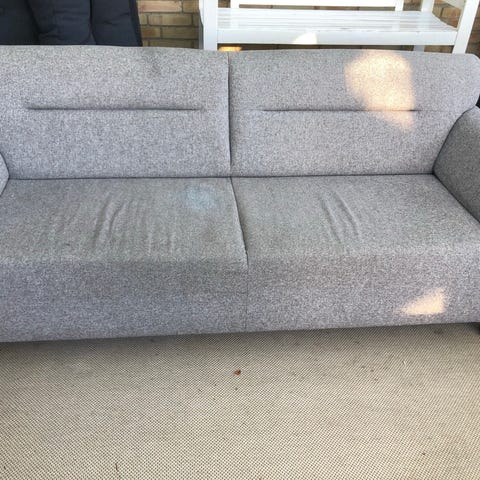 IKEA sofa i gråt stof. Sofaen har tre ryghynder og faste armlæn i begge sider. Den står på lave ben og har et enkelt, moderne design, velegnet til stue eller opholdsrum. Farven er neutral grå, som passer ind i mange forskellige indretningsstile.