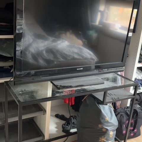 Tv-bord med sort glasplade og underdel med flere skuffer til opbevaring. Bordet har en øverste hylde i glas, som bæres af metalben, og en lavere enhed med udtræksskuffer i sort finish. Egnet til placering af tv, medieudstyr og til opbevaring af fx kabler, fjernbetjeninger og andre mindre genstande i stuen eller tv-rummet.