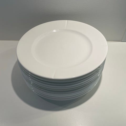 Rosendahl tallerkener i hvidt porcelæn. Klassiske, runde kagetallerkner med enkel inddeling i kanten.