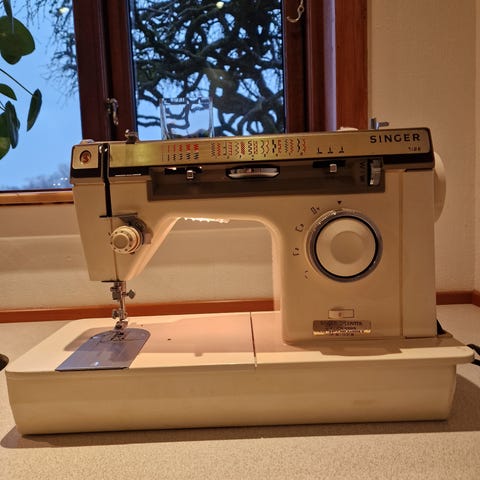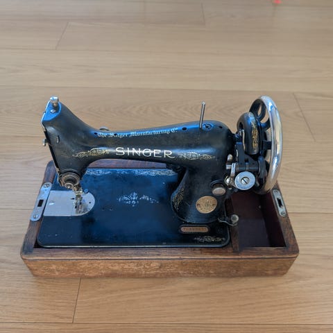 Denne symaskine er en klassisk Singer model 99K. Det er en af de mest ikoniske og holdbare modeller fra Singer, kendt for sin kompakte størrelse og robuste metalkonstruktion.