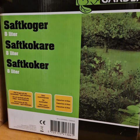 Dampsaftkoger i aluminium. Består af flere dele stablet oven på hinanden med låg, håndtag i siderne og slange til aftapning af saft. Velegnet til fremstilling af saft ved hjælp af damp, hvor frugt eller bær placeres i den øverste del, vand i den nederste del, og saften opsamles i midterdelen og tappes gennem slangen.