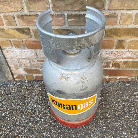 Gasflaske i kompositmateriale i blå/hvid farve. Flasken har bæregreb i toppen og ventil til tilslutning af gasudstyr. Velegnet til brug med gasgrill, terrassevarmer eller andet gasudstyr, hvor kompositflasker kan anvendes.