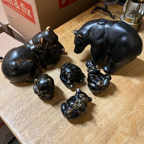 Keramik bjørnefigurer i brun og sort nuancer. Små dekorative figurer, der kan bruges som pynt på hylde, reol eller vindueskarm. Velegnet som indretningsdetalje i stue, børneværelse eller andre rum i hjemmet. 2 stk