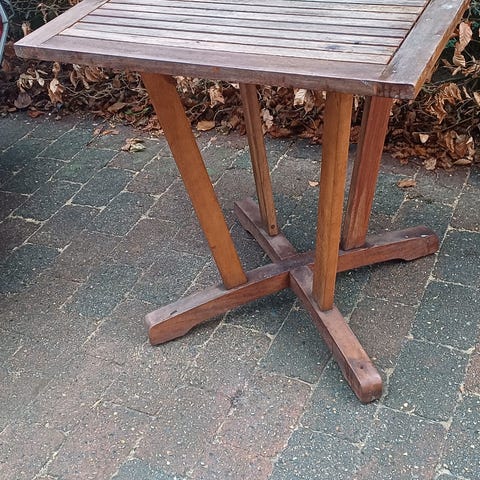 ALTAN bord Jutlandia hårdttræ med kvadratisk bordplade i lameller. Bordet har buede ben og en mindre rund hylde nederst mellem benene. Velegnet som sidebord eller lille cafébord, eksempelvis til altan, terrasse eller stue.