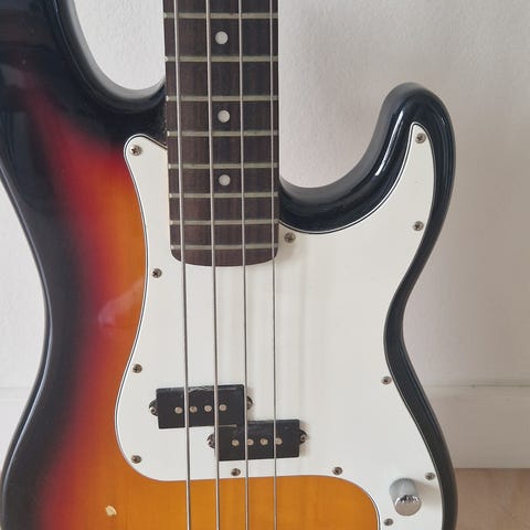 Blandet lot bestående af én elbas og to akustiske guitarer fra ukendt mærke. Elbassen har fire strenge og klassisk elbas-korpus med sort frontplade. Den ene akustiske guitar er en hul, halvakustisk model med f-huller, og den anden er en mindre fuldt akustisk guitar med træfinish. Instrumenterne står på et stativ og fremstår brugte. Egnede som reservedele, reparation eller projekter for gør-det-selv interesserede.