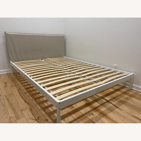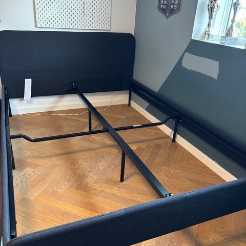 IKEA sengeramme UDEN madras. Rammen har gråt betræk og træben, Velegnet som enkeltseng i soveværelse, gæsteværelse eller som ekstra seng. Sengen står direkte på gulvet via benene og kræver ikke lamelbund ud over den integrerede konstruktion i rammen.