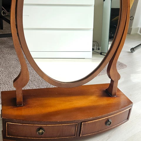 Maritimt Spejl med rundt spejlglas og ramme i brunlakeret træ. Spejlet står på en fast bundplade, som giver stabilitet på bord eller kommode. Velegnet som toiletspejl eller dekoration i soveværelse, entré eller badeværelse, hvor der er behov for et fritstående spejl.