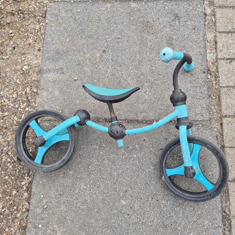 Løbecykel og plæneklipper / græsslåmaskine gives væk. Der er lidt rust på løbecyklen, men kører ellers helt kanon, og der er lidt beton klatter på den ene plæneklipper.