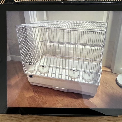 Fuglebur i hvidt metal. Buret sælges for kun 200 kr. målen er b 82.5. . D 43 . H 67