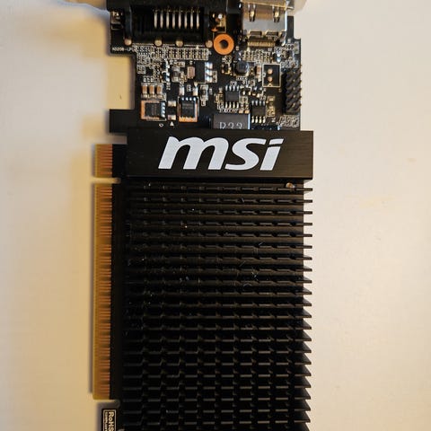MSI grafikkort til stationær computer. Kortet har én stor køleblæser og kompakt kølerdesign, egnet til systemer med begrænset plads. Tilsluttes via PCIe-slot på bundkortet. Velegnet som dedikeret grafikløsning til almindelig brug og let gaming, afhængigt af den præcise model og øvrig hardwarekonfiguration.