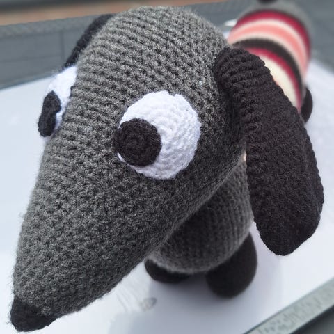 Hæklet bamse formet som en hund i rosa og lyserød. Bamsen har lange arme, korte ben og broderet snude og mund. Der medfølger matchende hæklet hue med bindebånd samt et par små hæklede støvler i samme rosa farve. Velegnet som legetøj eller pynt på børneværelset. Materiale fremstår som garn, sandsynligvis bomuld eller akryl.