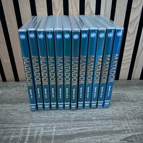 Matador dvd samling med tv-serien Matador. Bokse med alle episoder, herunder blandt andet "Den rejsende & Genboen 1929". Dvd’erne er fordelt på flere etuier markeret med episodenumre på ryggen. Egnet til afspilning på standard dvd-afspillere, hvor man ønsker hele serien samlet fysisk.