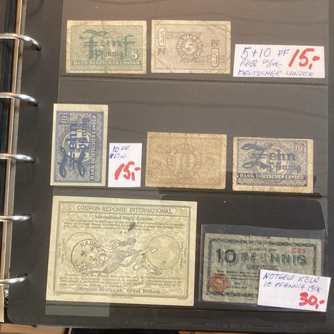 Sælger en samling af gamle pengesedler fra forskellige europæiske lande – perfekt for samlere eller som eksotisk indslag i en samling.