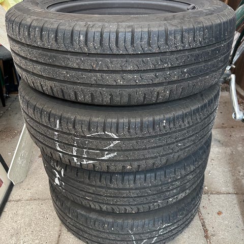 4 stk sommerdæk med stålfælge. Masser af mønster på rigtig pæne fælge. Dæk er fra 2013 men med 5-6 mm mønster og uden sprækker. Nyligt afbalanceret.