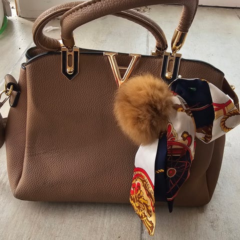 Fint håndtaske til kvinder i sort kunstlæder. Tasken har quiltet mønster og korte hanke, der er fastgjort med store guldfarvede metalringe. Der medfølger en guldfarvet vedhængsdetalje på forsiden. Tasken lukkes med lynlås foroven og har et lyst inderfor. Velegnet som mindre hverdagstaske eller til brug ved særlige lejligheder.
