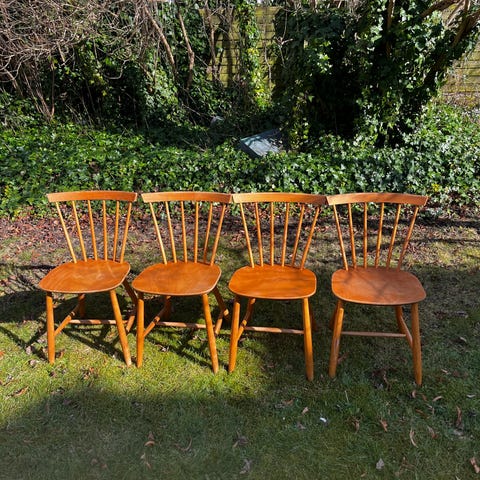 De klassiske stole fra FDB, der er malet sorte. Købt brugt for et par år siden, hvor de allerede var malet, så jeg ved ikke hvilken træsort, det er.