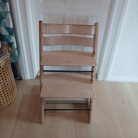 Klassisk og solid Tripp Trapp stol i træ. Stolen fungerer som den skal, men trænger til en kærlig hånd og har nogle ridser efter brug.