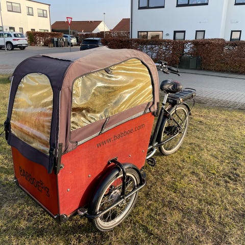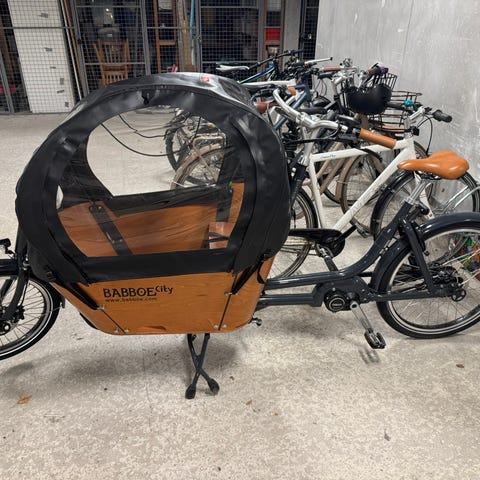 Dette er den gamle model med baghjulsmotor som gør den lidt tungere at cykle på, vi har dog ikke haft et problem med at cykle rundt på Aarhus’ bakker så længe lasten ikke er alt for tung😊