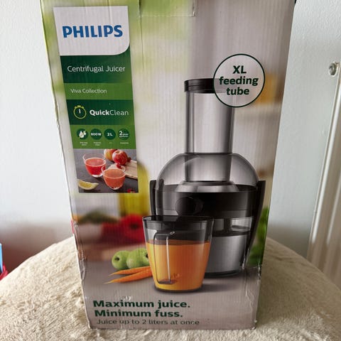 Med denne Philips Viva Collection Juicer HR185670 kan du skænke dig selv et glas frisk juice hver dag. Denne juicer er let at betjene og hurtig at rengøre. Lav op til 2 liter juice af din yndlings frugt og grønt på ingen tid.
