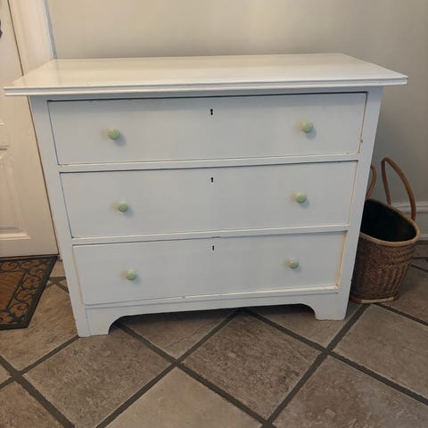 Gammel tjenestepigekommode med skuffer. Har fået nye ben og er blevet malet hvid. Skufferne kører fint. Nøgle findes ikke. Skal hentes på Frederiksberg.