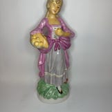 Figuren viser en kvinde i traditionelt tøj, lavet af porcelæn. Hun har en mørkeblå bluse og en lysere nederdel. I hånden holder hun en skål, mens to små, hvide ænder står foran hende. Glansfuld overflade.