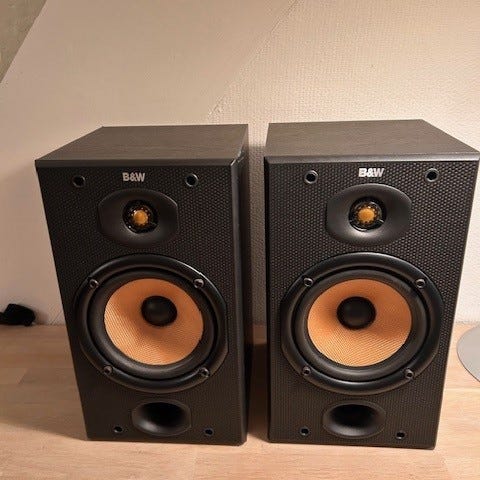 Bowers & Wilkins DM601 S3 højtalere i sort kabinet. Kompakte reolhøjtalere med frontmonteret basrefleksport, diskant øverst og mellemtone/basenhed med kobberfarvet membran. Bagsiden har bi-wiring/bi-amping terminaler med fire guldfarvede tilslutninger. Velegnet som stereo- eller surroundhøjtalere i et hjemmeanlæg. Modellen er passiv og kræver tilslutning til en forstærker eller receiver via højtalerkabel. Diskanterne har fået et tryk som ses på billederne. Derfor prisen