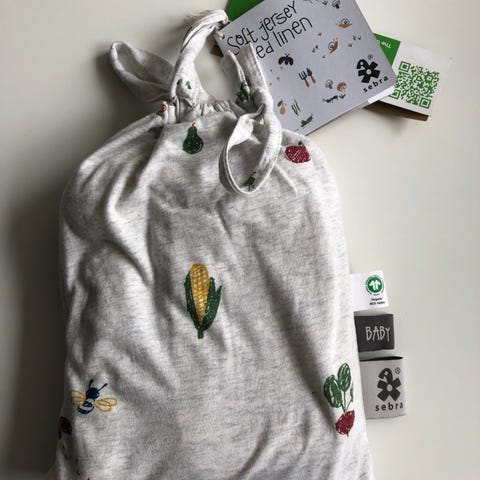 Beskrivelse: Produktet har små bærestropper og snøre, hvilket gør det egnet til opbevaring eller som pose til børneudstyr. Tekstilet er mærket med økologisk certificeringstags