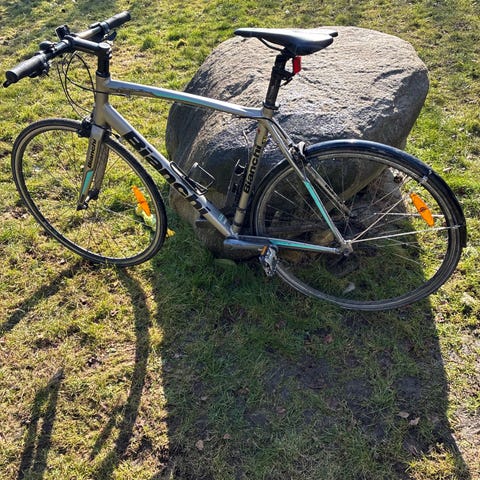 Bianchi hybridcykel til unisex med 52 cm stel og 28"/700c hjul. Cyklen har lige styr og er egnet til både bykørsel og pendling. Stel og forgaffel er i fast konstruktion uden affjedring. Udstyret med håndbremse for og bag samt støtteben. Sadlen er i sportstypisk udformning, og cyklen har smalle dæk, der er velegnede til kørsel på asfalt. Farven er primært hvid med blå Bianchi-logoer og detaljer.