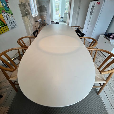 Stort dejligt spisebord med 2 tillægsplader der ligger under pladen. Der kan snildt sidde 3 på hver side uden tillægsplader samt 1 for hver ende.