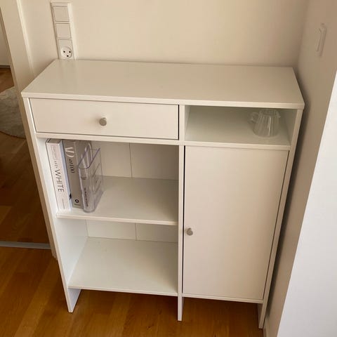 Super fint IKEA HAUGA skænk i hvid med nye greb i lyserød. Står fint med lidt brugsspor. Købt i 2022. Hurtig afhentning prioriteres.