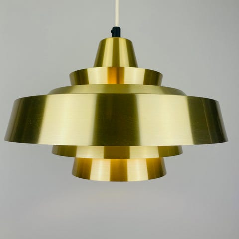 Lampen har en række stablede, cirkulære metalskærme, der gradvist bliver mindre i størrelse og skaber en etageopbygget effekt. Det øverste lag er i en klar gul farve, som giver lampen et markant, retro udtryk, mens de nederste lag fremstår i en blød hvid tone, der fordeler lyset jævnt over hver enkelt skærm.