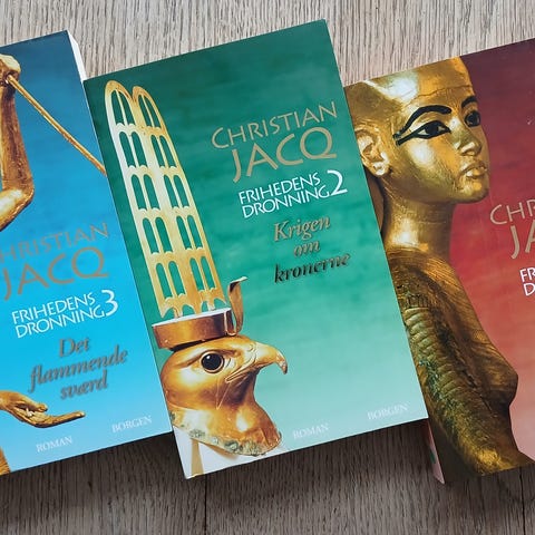 Bøgerne "Den vise kvinde" og "Paneb den iltre" er romaner med temaer fra det gamle Egypten. Omslagene viser egyptiske motiver og indgår i serien "Den lyseblå sten". Velegnet til læsere med interesse for historiske romaner og fortællinger inspireret af oldtidens Egypten. Bøgerne er indbundet, se billede...