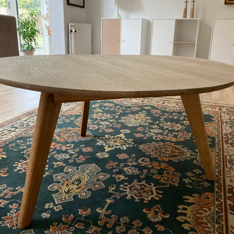 Super flot rundt sofabord i massiv egetræ. Fremstår særdeles pænt og ingen synlige brugsspor. Bordpladen har en ganske lille revne som er svær at se, hvilket også er grunden til den meget lave pris. Bordet sælges ikke til en lavere pris.