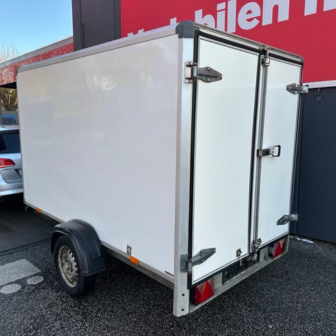 Lukket kasseanhænger i hvid. Traileren har fast tag og sider, der beskytter indholdet mod vejr. Bagtil er der to lodrette støtter og låsbar bagklap, som kan åbnes nedad som rampe for nem ind- og udlæsning. Anhængeren er udstyret med skærme over hjulene, reflekser og baglygter. Velegnet til transport af gods, udstyr eller lignende, hvor der er behov for lukket og overdækket last.
