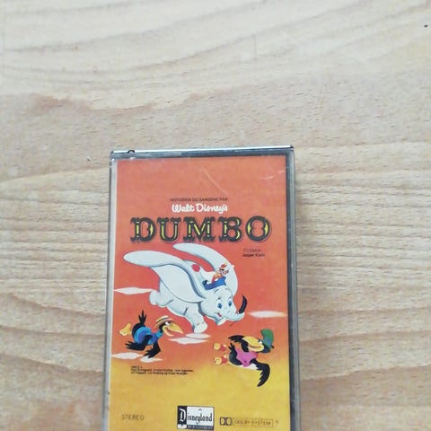 Walt Disney Dumbo kassettebånd med fortællingen og sange fra filmen. Båndet indeholder danske versioner af numre som blandt andet "Hold øje med hr. Stork", "Lokomotivet kører nu afsted", "Cirkusarbejdernes sang", "Lille barn", "De lyserøde elefanter" og "Da jeg så en elefant flyve". Indlæst og fortalt på dansk med medvirkende stemmeskuespillere angivet på omslaget.