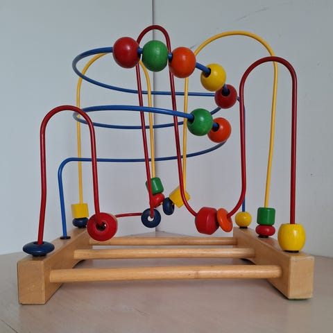 IKEA kuglebane trådlabyrint legetøj i træ med farvede metalbuer og træperler i forskellige former og farver. Basen er i lyst træ, og buerne er i flere farver med tilhørende perler, der kan skubbes langs trådene. Egnet som aktivitetslegetøj til mindre børn til øvelse af finmotorik og hånd-øje-koordination. Kan placeres på bord eller gulv under leg.