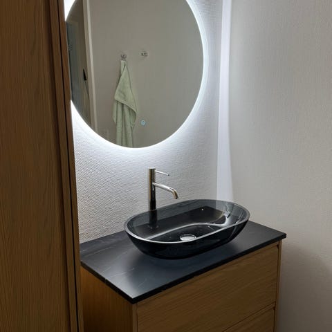 Håndvask med integreret bordplade i sort materiale. Vasken er oval og nedfældet i bordpladen, og der er monteret armatur. Egnet til brug i badeværelse, bryggers eller lignende rum, hvor der er behov for en kompakt vaskeløsning med sammenhængende bordplade.