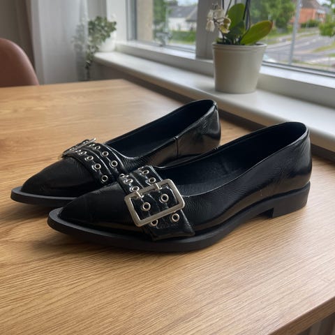 Klassisk ballerinamodel med rem over vristen. Velegnet som hverdagssko eller til mere formelle anledninger.