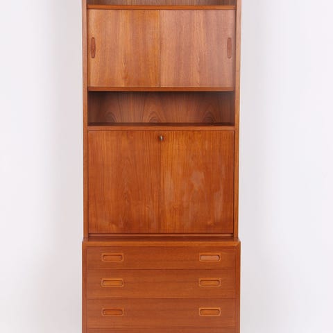 Hundevad reol består af et underskab med hylde, bestikskuffe og musikhylde. Foran låger. Dybde: cm. 43 cm. Reol med flytbare hylder i møbeltræ, med teak finér. Dybde: 30,5 cm.