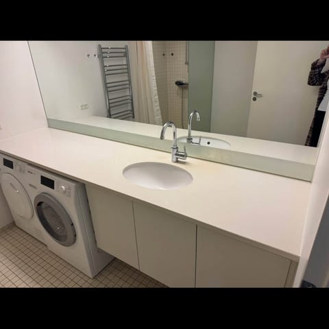 Flot hvid Corian bordplade, med super glat overflade, nemt rengøring og vedligeholdelse, kan slibes med sandpapir korn 300 for at få den silkebløde overflade frem igen efter flere års brug,
