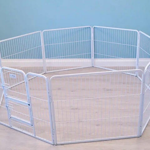 Hvalpegård i metal med låge foran. Egnet til indendørs brug til afgrænsning af område til hvalpe eller mindre hunde. Består af flere sammenhæftede sektioner, der danner en firkantet indhegning. Lågen kan åbnes for nem adgang til dyret. Kan placeres på gulv og flyttes efter behov.