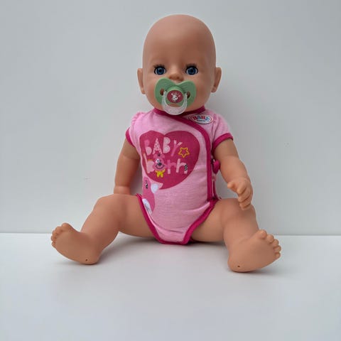 Hånddukke, Zapf Creation, d-96472 Rodental, med lang hår, bluse, buks og sko fra Baby Born, bøjelige knæ, 46 cm lang, munden er åben, og hun har "slugt" noget som rasler, når man ryster hende, ikke noget der mangler :). Hun er super sød, kommer fra ikke ryger hjem, og meget velholdt. Sælges for 99 kr. Sender gerne.Dog IKKE med fiks færdig. porto oveni