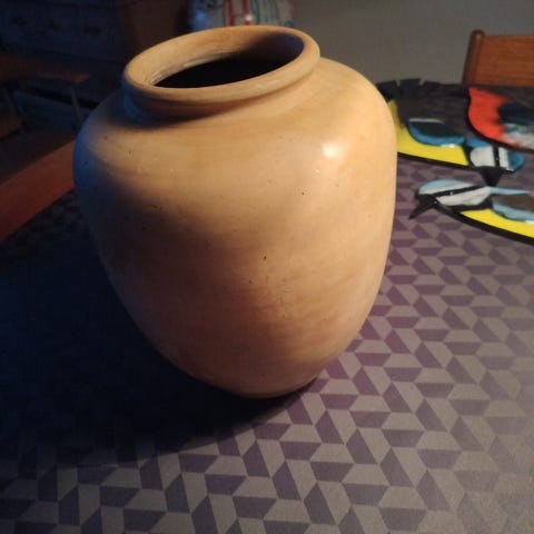 Krukke i keramik i gul-blå nuancer med glaseret overflade. Krukken er rund og maveformet og står på en matchende underskål. Egnet til udendørs eller indendørs beplantning, f.eks. mindre træer, buske eller prydplanter.højde 58 cm har 2 stk pris 250kr pr stk incl jord