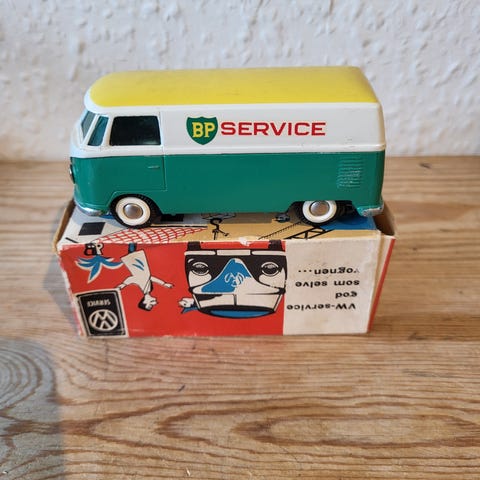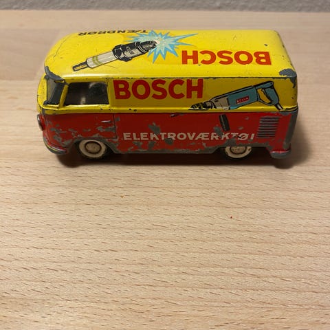 Bosch modelbil varevogn i metal i rød og gul farve. Modellen forestiller en klassisk varevogn med Bosch-reklame på sider og tag. Bilen har trykte detaljer som døre, vinduer og logoer samt frilagte hjul under bunden. Egnet som samlerobjekt eller dekoration, f.eks. til hylde, reol eller modelbil-samling.