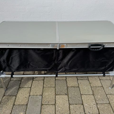 Sammenklappeligt bord med metalstel og bærehåndtag. Bordet kan foldes sammen til kuffertformat for nem opbevaring og transport. Egnet til brug udendørs og indendørs, f.eks. til camping, havebrug eller ekstra bordplads ved arrangementer.