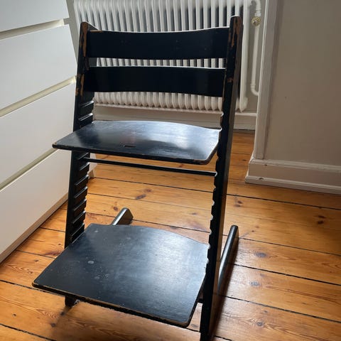 Stokke Tripp Trapp højstol i sortmalet træ. Klassisk justerbar højstol hvor både sæde og fodplade kan flyttes i højde og dybde, så stolen kan tilpasses barnets størrelse.
